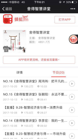 拿如今在年輕、中產(chǎn)人群中比較時(shí)髦的互聯(lián)網(wǎng)音頻平臺(tái)來(lái)說(shuō),相信很多人對(duì)蜻蜓FM、喜馬拉雅FM、荔枝FM等并不陌生,這些平臺(tái)動(dòng)輒有數(shù)億的注冊(cè)用戶,日活用戶能達(dá)到1000萬(wàn)以上。最近無(wú)意間聽(tīng)到了蜻蜓FM上一檔《舍得智慧講堂》的音頻節(jié)目,這檔節(jié)目是舍得酒業(yè)與蜻蜓FM共同打造的自制音頻節(jié)目,由著名經(jīng)濟(jì)學(xué)博士馬紅漫擔(dān)任主播,分享一些俞敏洪、雷軍、劉強(qiáng)東、董明珠等30位中國(guó)成功創(chuàng)業(yè)家的智慧人生,節(jié)目非常自然地將中國(guó)優(yōu)秀的傳統(tǒng)文化舍得智慧,以講述故事的方式,融入到了企業(yè)家成長(zhǎng)史和商業(yè)智慧中。這種用互聯(lián)網(wǎng)音頻方式娓娓道來(lái)的形式,給人耳目一新的感覺(jué)。