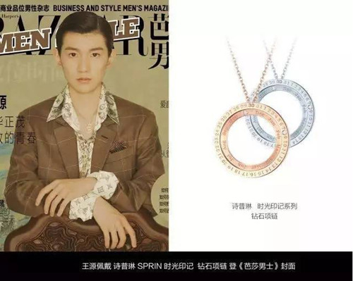 詩普琳珠寶與《芭莎男士》為王源生日特別定制了專屬項鏈,上面刻有“1108”王源的生日日期,這個讓粉絲和王源本人都難忘的時刻,將明星和“時光印記”系列產(chǎn)品緊密結(jié)合了起來,也為“時光印記博物館”造勢。詩普琳珠寶攜手時尚集團合作聯(lián)手打造了王源的《芭莎男士》六月刊封面照片,而封面的Total Look正是LV2017春夏款和詩普琳珠寶的“時光印記”系列項鏈。