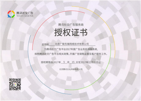 2017年度騰訊社交廣告服務(wù)商授權(quán)證書示例(掃描證書二維碼,即可查驗(yàn)真?zhèn)危?nbsp;
