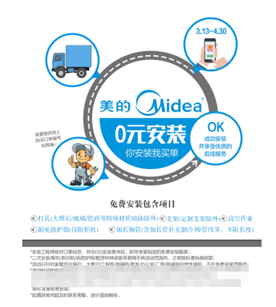 美的空調(diào)本著“以用戶為中心”的原則,開啟了4月的“超級(jí)服務(wù)月”活動(dòng),在空調(diào)購買高峰期提供空調(diào)O元安裝服務(wù)。記者從天貓美的空調(diào)旗艦店了解到,免費(fèi)安裝包含項(xiàng)目如下:1打孔(大理石/玻璃/瓷磚等特殊材質(zhì)墻體除外) 2、支架(定制支架除外)3、高空作業(yè)4、漏電保護(hù)器(僅限柜機(jī))5、加長銅管(含加長管補(bǔ)充制冷劑/管線等,不限長度)