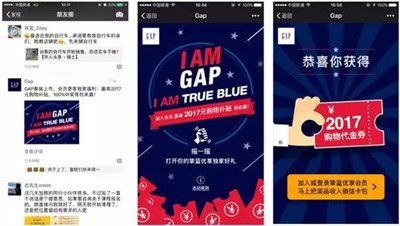 2017年春節(jié)過后,GAP在微信朋友圈投放了一次廣告。用戶點(diǎn)擊廣告即可領(lǐng)取GAP的代金券。這些2017元到20.17元不等的代金券可以吸引用戶到線下使用和消費(fèi)。