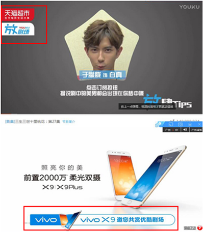 e.g. 云南白藥牙膏——優(yōu)酷《三生三世十里桃花》壓屏條植入