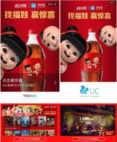 ??從傳統(tǒng)媒體到新媒體,可口可樂(lè)一直走在廣告創(chuàng)新?tīng)I(yíng)銷(xiāo)的前沿,希望產(chǎn)品能直接與萬(wàn)千消費(fèi)者產(chǎn)生情感連接;作為視頻行業(yè)的領(lǐng)頭者,優(yōu)酷加入阿里大文娛生態(tài)后在品牌營(yíng)銷(xiāo)模式上就積極進(jìn)行著“全鏈路營(yíng)銷(xiāo)”探索。上個(gè)月,支付寶正式上線(xiàn)紅包大招“AR實(shí)景紅包”,“LBS+AR+紅包”的交互方式立刻點(diǎn)燃了人們對(duì)“紅包”的新熱情。由于搶紅包時(shí),需要滿(mǎn)足地理位置和AR實(shí)景掃描兩個(gè)條件, 更凸顯了“藏”和“搶”的樂(lè)趣。作為AR實(shí)景紅包的上線(xiàn)合作伙伴, 可口可樂(lè)將新年紅包藏在其新春標(biāo)志形象“阿嬌阿?!鄙砩? 用戶(hù)不僅可以在可口可樂(lè)新春包裝、戶(hù)外廣告和店內(nèi)堆頭上找到各種形象憨態(tài)可掬的“阿嬌阿?!毙蜗? 更可以在優(yōu)酷可口可樂(lè)新春劇場(chǎng)、視頻廣告、UC APP、天貓魔盒等覆蓋移動(dòng)端和家庭場(chǎng)景的多端媒體曝光中找到他們的身影。