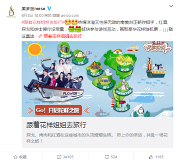 ??除了微信平臺,微博平臺也很熱鬧。熱播的《花樣姐姐2》不僅有重量級明星加盟,還集結(jié)一眾小鮮肉共赴美洲之約,美人美景想不吸睛都難。節(jié)目播出期間,作為獨家冠名商,美多絲在微博上引發(fā)了廣泛討論,僅#跟著花樣姐姐去旅行#話題頁閱讀量就達到了3222萬,美多絲在其中不僅靠素材植入的方式完成廣告宣傳,同時還與網(wǎng)友積極互動,為李治廷做的吐槽視頻#大治若愚#閱讀量同樣達到了138.5萬,加上各種有趣的互動小游戲,在網(wǎng)絡(luò)上實現(xiàn)了出色的二次傳播。