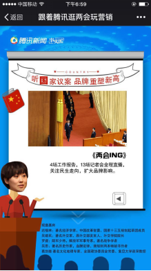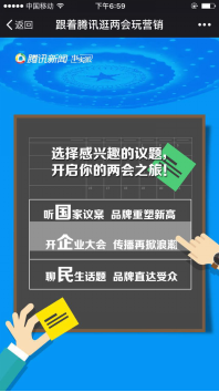 騰訊新聞始終致力于打造品牌與各級目標受眾零距離接觸的最佳平臺。2016年“全國兩會”,騰訊新聞在保持內(nèi)容優(yōu)質(zhì)水準的基礎(chǔ)上,特別開設(shè)三大板塊,分別為“聽國家議案”,“開企業(yè)大會”和“聊民生話題”,從國家議案、企業(yè)發(fā)展再到國民生活,三大維度360度直擊兩會。兩會《高端訪談》誠邀經(jīng)濟、政治、軍事、歷史、文化界高人呈現(xiàn)干貨內(nèi)涵,《兩會 ING 》全程直播4場工作報道、13場記者會,幫助品牌在國家議案的激辯中獲得高曝光,重塑品牌新高?!洞笈谟屑s》打造商界第一真人秀,《中國硬實力》集《中國人的一天》、《新聞百科》與《圖話》三大良心欄目,針對企業(yè)核心受眾,掀起品牌傳播高潮。針對年輕一代的80后、90后等核心消費人群,騰訊《新聞百科》也開設(shè)了他們感興趣的“二胎政策”、“國人幸福感”等熱點話題,匯聚億萬人焦點,并可為品牌定制私人話題。《新聞哥路邊攝》更通過創(chuàng)新的隱蔽拍攝方式,制造“高富帥街邊搭訕”、“路人掉錢包”等相當接地氣的話題及深度調(diào)查,深入社會真實狀況,涵蓋國民生活百態(tài)。這三個板塊通過多維度、全方位的選題策劃,體現(xiàn)了騰訊新聞一流的制造話題實力,不僅網(wǎng)羅黨政機關(guān)工作人員、企事業(yè)管理者決策者、高端白領(lǐng),更輻射億萬普通民眾,使品牌受益。