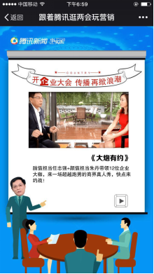 騰訊新聞并不只有這些“嚴肅新聞”的呈現(xiàn),兼具深度與娛樂的節(jié)目也同樣有大咖站臺——《大炮有約》特邀地產(chǎn)領(lǐng)袖任志強與12位企業(yè)大咖來一場超越跑男的商界真人秀。帶有娛樂色彩的新聞形式不僅是傳統(tǒng)新聞傳播形式的創(chuàng)新,更在吸引用戶點擊、關(guān)注方面具有天然優(yōu)勢,適合品牌在輕松娛樂的氛圍中傳遞核心信息,不僅精準,更能實現(xiàn)用戶自發(fā)傳播的效果。強勢的大咖集合,將讓騰訊新聞在今年的兩會中鋒芒畢露,借勢騰訊新聞,必將為品牌贏得超強聲量。