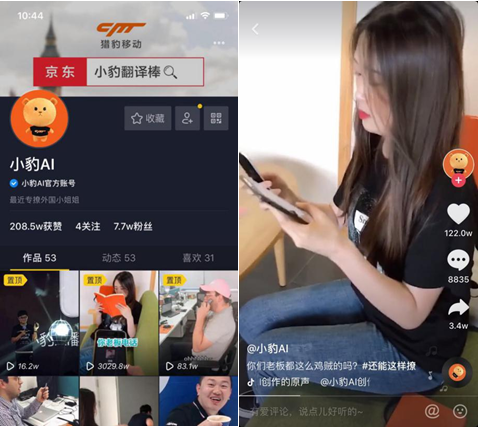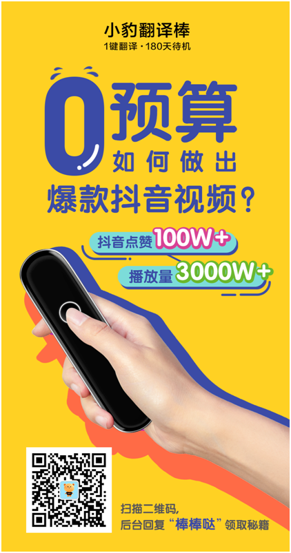 抖音小豹AI官方賬號發(fā)布的這只33秒小視頻,展示的是一款叫“小豹AI翻譯棒”的產(chǎn)品,市場部的運營團隊將辦公室日常結(jié)合小豹AI翻譯棒的功能編輯成段子,發(fā)布之后在短短幾小時迅速霸屏抖音。