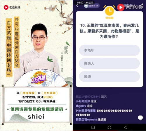 詩詞專場的主持人就是中國古文學(xué)界的泰斗,北京師范大學(xué)的酈波教授,其在《百家講壇》上對明朝文化的詮釋至今令人嘆為觀止。在《百萬英雄》中國詩詞專場中,酈波教授對各種古典人物性格故事娓娓道來,既能及時把握直播答題節(jié)奏,又不失風(fēng)雅,將中國上千年的教授儒風(fēng)表現(xiàn)的淋漓盡致。