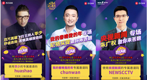 除了文化大家,《百萬英雄》還請來了專業(yè)主持人助陣。央視新聞當(dāng)家“段子手”朱廣權(quán),央視春晚主持人尼格買提。還有,當(dāng)下炙手可熱的王牌主持華少,以其著名的“華少語速”和業(yè)界一流的舞臺經(jīng)驗為網(wǎng)友帶來獨具風(fēng)格的答題體驗。