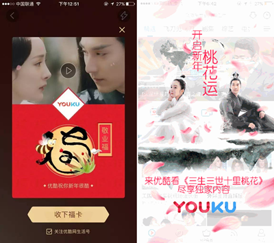 ??2月14日,情人節(jié)當(dāng)天北京西單站地鐵成為了桃花的天下。進(jìn)出地鐵站的人群都可以“種植”桃花林,派發(fā)桃花簽,免費領(lǐng)取桃花禮品……無論你是否《三生三世》的粉,路過這里都不禁停下腳步,拍照、合影、發(fā)朋友圈。而這場活動背后的推手還是優(yōu)酷。