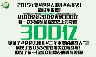 4個月,6組父子(女),8站旅行,16期節(jié)目,芒果TV全網(wǎng)獨播的《爸爸去哪兒3》以超15億的總播放量完美收官,相較第二季增長了180%;#爸爸去哪兒#微博話題閱讀量突破329億,討論人數(shù)超過4156萬,超高的用戶關注強勁領跑全行業(yè),《爸爸3》吸引了日化、汽車、電商、數(shù)碼等近40家品牌競相爭投。芒果TV深挖內容精耕細作,捕捉用戶行為喜好,一整套創(chuàng)新玩法,讓合作品牌廣告主獲得了超值回報。