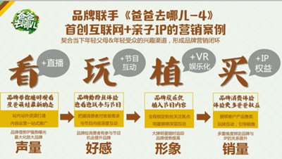 無疑,玩法升級的《爸爸去哪兒4》在保留前面幾季節(jié)目的精華的基礎上,多維創(chuàng)新打造頂級親子盛宴,比如拍攝期間每天固定時間直擊現(xiàn)場,“直播+點播”為品牌帶來超強曝光,同步推出多檔相關衍生節(jié)目,IP影響力集中釋放……品牌將聯(lián)手芒果TV《爸爸去哪兒4》首創(chuàng)互聯(lián)網(wǎng)+親子IP的營銷案例,契合當下年輕父母&年輕受眾的興趣渠道,與觀眾建立情感溝通形成品牌營銷閉環(huán),通過看(直播)、玩(節(jié)目互動)、植(VP娛樂化)、買(IP權益)營銷四部曲,步步為營將品牌傳播層層推進,多維度綁定品牌與IP關系,為品牌帶來實實在在的銷量轉化。