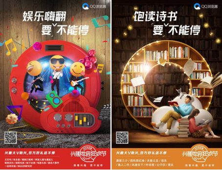 在內(nèi)容的傳達(dá)上,QQ瀏覽器此次興趣營銷通過話題參與和發(fā)布聯(lián)合海報的形式,緊密貼近品牌理念以及此次興趣活動的主題,將QQ瀏覽器的品牌理念和狂歡活動的興趣意義傳達(dá)給更多的用戶。