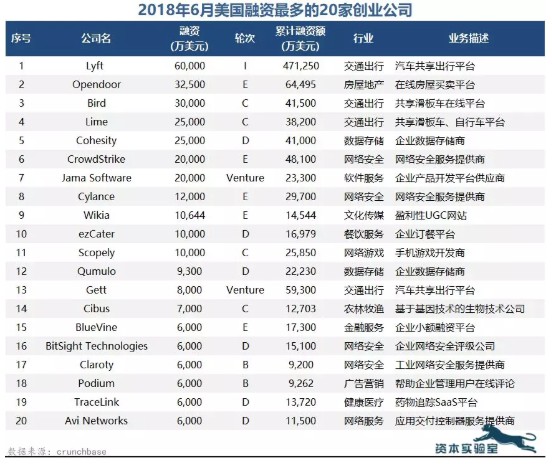 根據(jù)CrunchBase的統(tǒng)計(jì)數(shù)據(jù)顯示,6月份,美國融資最多的20家企業(yè)的融資額超過31億美元。