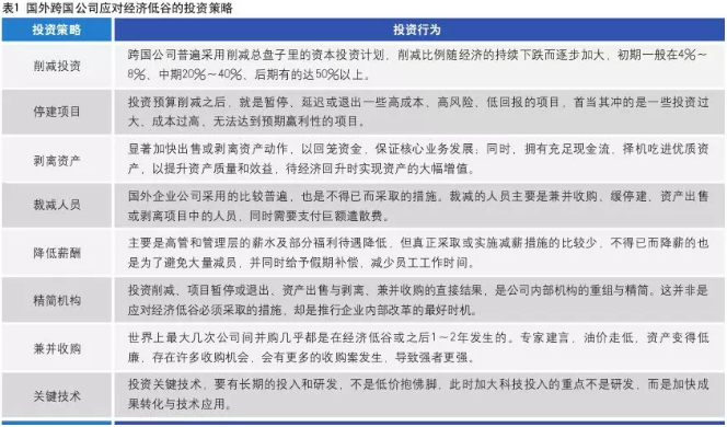 各企業(yè)應(yīng)對經(jīng)濟(jì)低谷的措施,因企情、域情、國情不同,采用的投資策略也不盡相同。有的直接針對“寒冬期”的投資需求,有的是搶抓機(jī)會,既有成功的經(jīng)驗(yàn),也有失敗的例子。