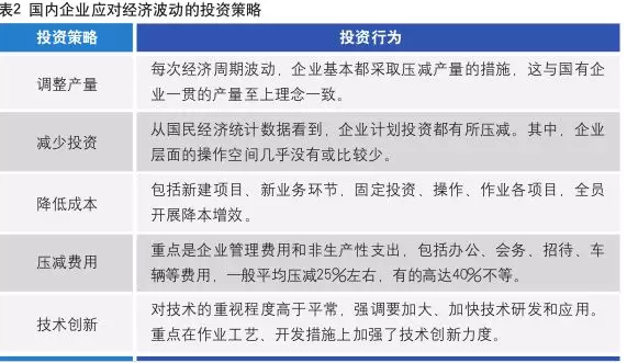我國企業(yè),尤其國有企業(yè),應(yīng)對經(jīng)濟(jì)周期波動的投資策略基本相同,采取的最重要舉措是收縮投資,具體措施概括為六個方面(見表2)。其中,企業(yè)的關(guān)注點(diǎn)普遍集中在調(diào)產(chǎn)量、降成本和保效益三方面,效益投資理念成為核心理念,主導(dǎo)了各項投資策略的制定、實(shí)施。