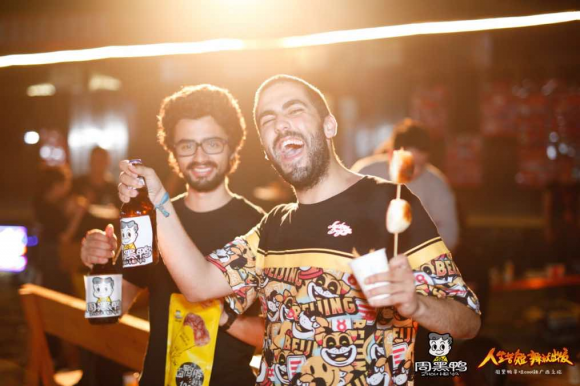 (外國(guó)友人盡情享受一口啤酒一口周黑鴨的放松時(shí)刻)