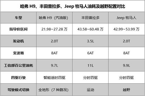 值得一提的是,在哈弗H9、普拉多和牧馬人三款主流硬派越野SUV的對比中,我們可以看到,即便是哈弗H9接近2.4噸的自重是三款車型當(dāng)中最重的,但它的綜合油耗仍然喜人。