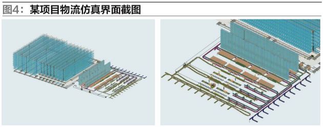 圖4為今天國(guó)際物流技術(shù)股份有限公司為某物流中心項(xiàng)目制作的項(xiàng)目仿真截圖,項(xiàng)目包含:托盤堆垛機(jī)、箱式堆垛機(jī)、托盤輸送線、箱式輸送線、分揀線、拆碼垛機(jī)器人、AGV等。對(duì)于這種多設(shè)備耦合的復(fù)雜物流系統(tǒng),通常情況下針對(duì)項(xiàng)目中的核心單機(jī)設(shè)備能力進(jìn)行計(jì)算是無(wú)法檢驗(yàn)說(shuō)明整個(gè)系統(tǒng)的理論工作能力的。而通過(guò)仿真模擬針對(duì)這個(gè)項(xiàng)目中的每一個(gè)設(shè)備進(jìn)行單獨(dú)建模,按照1:1組成項(xiàng)目設(shè)備的整體布局,輸入實(shí)際流量和軟件調(diào)度原則即可以對(duì)項(xiàng)目系統(tǒng)進(jìn)行仿真運(yùn)行模擬,可以很好的檢驗(yàn)項(xiàng)目中的單機(jī)工作能力以及由多種單機(jī)耦合在一起的復(fù)雜物流系統(tǒng)運(yùn)行的項(xiàng)目整體工作能力。當(dāng)針對(duì)項(xiàng)目的整體工作能力進(jìn)行仿真驗(yàn)證后,通常情況下還可以對(duì)項(xiàng)目綜合能力為目標(biāo)對(duì)項(xiàng)目進(jìn)行性能優(yōu)化。事實(shí)證明仿真模擬在項(xiàng)目規(guī)劃驗(yàn)證階段得出的結(jié)論與項(xiàng)目實(shí)施后現(xiàn)場(chǎng)進(jìn)行的測(cè)試基本相同,對(duì)項(xiàng)目中目標(biāo)性能的優(yōu)化也實(shí)現(xiàn)了系統(tǒng)能力的提升。