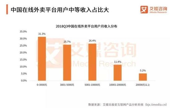 報告顯示,2018第3季度,中國在線外賣平臺用戶中等收入占比大。月收入低于1萬元的占比83.4%,其中,3千元以下的用戶占比31.3%,3千至5千元的用戶占比25.7%,5千至1萬元的用戶占比26.4%。