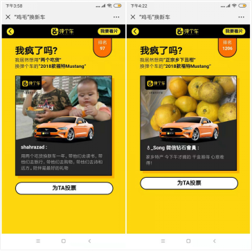 如果在你面前,有一個用“雞毛”換新車的機(jī)會,你會拿什么來換?前幾天,彈個車就推出了一個“雞毛換新車”的創(chuàng)意互動活動,消費(fèi)者用“雞毛”等小物件就能換取福特Mustang新車1年免費(fèi)使用權(quán)?;顒右唤?jīng)推出,就吸引了數(shù)千人參加,大家紛紛上傳各種稀奇古怪的小物件,用來換取新車。