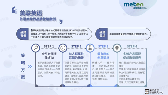 以外語學(xué)習(xí)類知名品牌美聯(lián)英語的案例為例,平臺首先依據(jù)用戶消費(fèi)者行為研究結(jié)果為美聯(lián)核心用戶畫像為白領(lǐng)、熱愛美食、時(shí)尚和運(yùn)動?;诖?,平臺精準(zhǔn)分析出該用戶群體的基本平臺瀏覽路徑,確定與之相匹配的場景,譬如出境游、餐廳和運(yùn)動健身場所,并進(jìn)一步將客戶訴求提煉為“情感共鳴”、“場景契合”和“講求趣味性”三大特點(diǎn)。