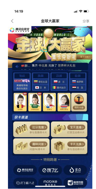 除此以外,應(yīng)用寶還加入陌陌聯(lián)合打造《金球大贏家》,參與者只要通過應(yīng)用寶、陌陌等多個平臺進(jìn)行金球卡的收集,集齊32張金球卡就有機(jī)會獲取5萬元大獎,為大眾營造“助威”的互動場景創(chuàng)造助威體驗。