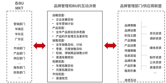 品牌、市場、銷售,乃至上下游的合作鏈,在各自的專業(yè)和職能的基礎上,要有互動決策的組織機制來統(tǒng)合,光民主不集中沒決策,只集中不民主不全面。有效的溝通決策機制舉例: