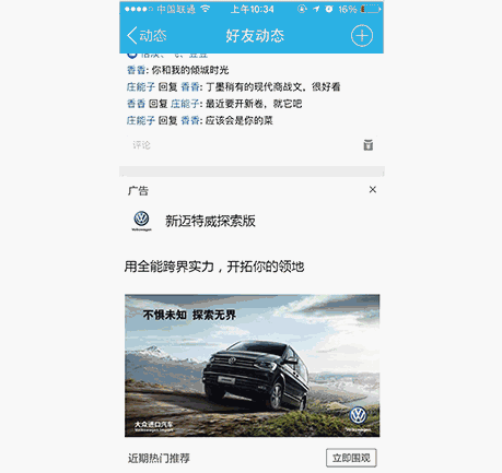 ??找到興趣人群并不意味著找到了消費(fèi)者需求。在場(chǎng)景投放方面,進(jìn)口大眾邁特威借助沉浸式的信息流廣告,自然而然地出現(xiàn)在信息流廣告中,實(shí)現(xiàn)了一次投放,多次曝光,成功收獲1.2億次曝光。