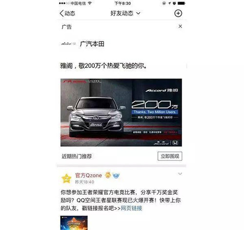??騰訊借助QQ瀏覽器指數(shù),能夠幫助車(chē)企洞察用戶偏好,這方面廣汽豐田新雅閣混合動(dòng)力版就有鮮活案例。在廣汽本田車(chē)主突破200萬(wàn)之際,通過(guò)QQ空間信息流廣告,將“敬200萬(wàn)個(gè)熱愛(ài)飛馳的你”展示在好友動(dòng)態(tài)中,讓廣告毫無(wú)違和感呈現(xiàn)在用戶眼中,同時(shí)借助“24期0利率”的優(yōu)惠政策打動(dòng)消費(fèi)者,最終實(shí)現(xiàn)了10億級(jí)別的曝光量。