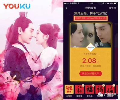 過年期間,優(yōu)酷也參與到支付寶的“集五福”活動中,使更多人“接觸”到《三生三世十里桃花》。楊振認為,“將用戶帶到場景里才是有最有意思的” 。