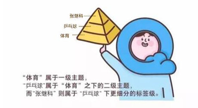 張繼科作為2016年奧運(yùn)會(huì)期間的“霸屏老公”,擁有眾多女性粉絲。那么如何將文章《女神節(jié),張繼科喊你一起來(lái)打球》進(jìn)行精準(zhǔn)推送呢?首先,從文章中可以獲得 “乒乓球”、 “張繼科”、 “體育” 這些關(guān)鍵信息,它們之間存在一些層級(jí)關(guān)系: