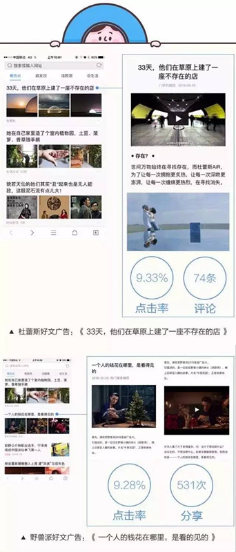 這樣的例子不是個(gè)案,前段時(shí)間,杜蕾斯和野獸派在QQ瀏覽器投放,廣告點(diǎn)擊率均達(dá)到9%以上,遠(yuǎn)高于行業(yè)普遍點(diǎn)擊率0.8%-3%的水平。