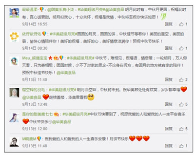 ??而中秋臨近時(shí),華美又推出了“祝福蓋樓”活動(dòng),幸運(yùn)的網(wǎng)友將 “獨(dú)霸”超級(jí)月亮,不僅拉近了與消費(fèi)者之間的距離,也使得華美月餅的認(rèn)知更加深入人心。