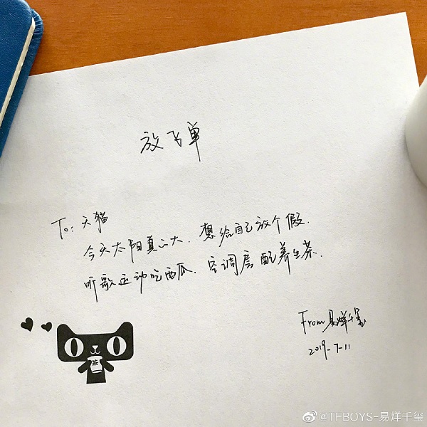 幾天前,易烊千璽在個(gè)人微博上曬出了自己手寫給天貓的打油詩(shī),“今天太陽(yáng)真的大,想給自己放個(gè)假,放飛單請(qǐng)查收”,隨后手動(dòng)艾特了天貓。截至發(fā)稿,這條“小小”的“放飛單”轉(zhuǎn)評(píng)超過(guò)了百萬(wàn),“與千璽理想生活一夏”話題閱讀更是超過(guò)了10億。