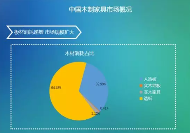 目前中國家居市場(chǎng)每年消耗的資源成遞增趨勢(shì)。在我國的木材消耗中,來自家裝及家居領(lǐng)域的消耗占比較大。據(jù)中國林產(chǎn)工業(yè)協(xié)會(huì)和前瞻產(chǎn)業(yè)研究院數(shù)據(jù)顯示,在每年的木材消耗中,家裝家居領(lǐng)域的占比持續(xù)走高,其中,人造板占比最高,為32.99%,而實(shí)木類家具產(chǎn)品總和占比則不足3%。