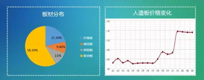 在板材分布中,膠合板占比最高,占58.3%,其次是纖維板,占21.3%,刨花板和其他板分別占9.4%、11%。2016年-2018年,人造板價(jià)格持續(xù)攀升,產(chǎn)品結(jié)構(gòu)優(yōu)化與綠色創(chuàng)新升級(jí)成為了企業(yè)轉(zhuǎn)型升級(jí)的核心之一。