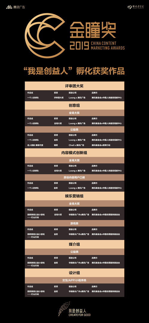 5月25日,由廣告門主辦的2019金瞳內(nèi)容盛典暨頒獎典禮在北京如期舉行。騰訊廣告狂攬38項(xiàng)金瞳獎,其中由 “我是創(chuàng)益人”公益廣告大賽孵化的作品,一舉包攬了4項(xiàng)重量級大獎共10座金瞳獎杯,交出了一份令人滿意的答卷。