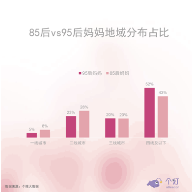 在一線城市中,95后媽媽占比低于85后,而在四線及以下城市中,95后媽媽占比顯著增高。對(duì)于母嬰行業(yè)而言,小城鎮(zhèn)正在成為下一個(gè)掘金點(diǎn)。