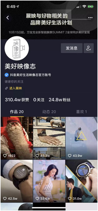 以萬(wàn)寶龍為例。抖音的內(nèi)容共建IP @美好映像志 在第一季開(kāi)創(chuàng)性的展映中,推出了為香奈兒J12 腕表精心制作的12支視頻。2018年10月15日,@美好映像志 第二季展映來(lái)了,這次的主角是萬(wàn)寶龍SUMMIT 2智能腕表。圍繞SUMMIT 2#不止向前#的品牌理念,抖音@美好映像志 在10月15日~20日期間共更新了六支短視頻。