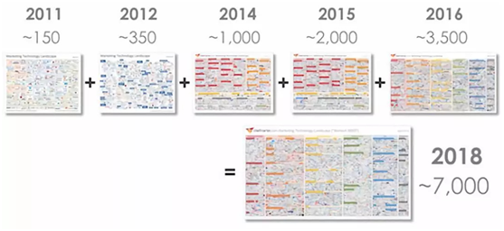 根據(jù)Scott Brinker整理的美國MarTech全景圖顯示,截至2018年,MarTech企業(yè)從150家迅速增長到近7000家,業(yè)務類別大大豐富。