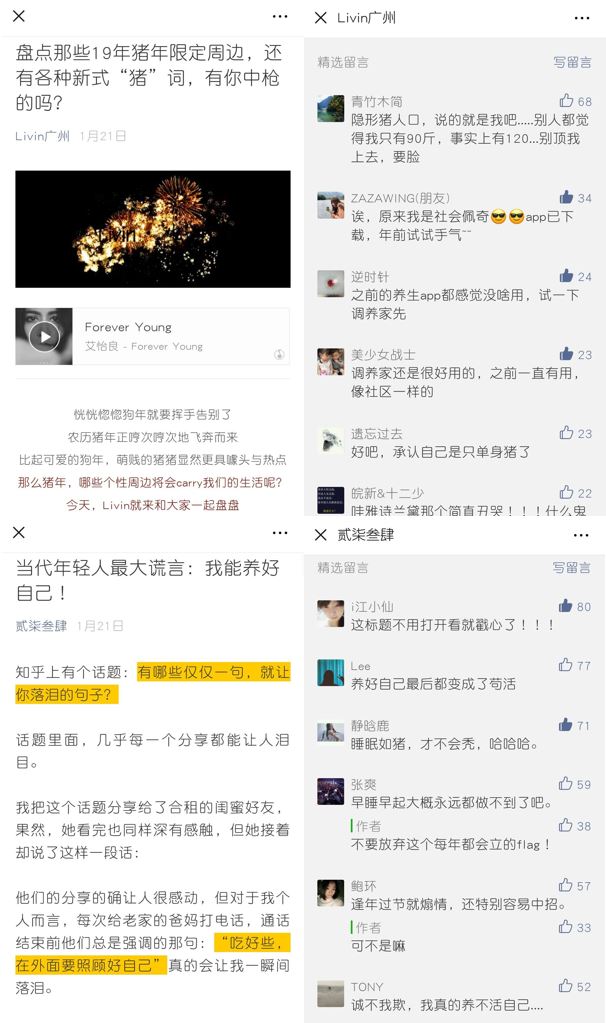 生活情感類微信大號以年輕人養(yǎng)生話題為切入點,走心的話題引發(fā)用戶情感共鳴,吸引了用戶的關(guān)注及互動分享,產(chǎn)出大量優(yōu)質(zhì)UGC;