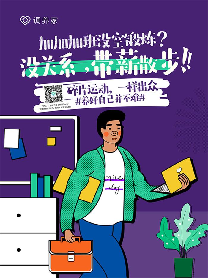 調(diào)養(yǎng)家一直以來倡導(dǎo)的“健康玩出來”理念,與年輕白領(lǐng)群體“邊造邊養(yǎng)”的心理很契合,此次傳播,調(diào)養(yǎng)家把溝通對象聚焦在北上廣一線城市白領(lǐng)群體,從飲食、運(yùn)動、起居、情志四個維度出發(fā),結(jié)合他們生活日常場景,推出了趣味的預(yù)熱海報,并在北上廣寫字樓進(jìn)行投放,個性十足的畫面設(shè)計,搭配有趣扎心的文案,直擊年輕人對健康的渴望與糾結(jié)心理。