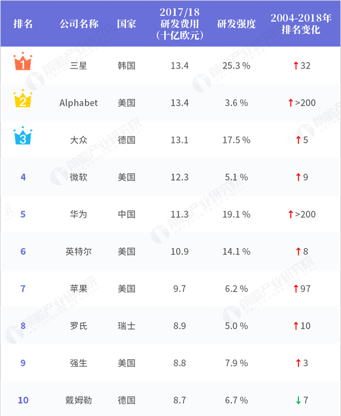近日公布的2018年全球企業(yè)研發(fā)投入排行榜中,三星以134億歐元的研發(fā)費(fèi)用位居第一。美國(guó)在前50的榜單中占領(lǐng)22席位,為所有國(guó)家中最多。德國(guó)位居其次,占領(lǐng)9席。