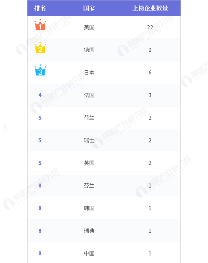 美國(guó)以22家企業(yè)上榜占據(jù)數(shù)量上的絕對(duì)優(yōu)勢(shì)。德國(guó)排名第二,有9家企業(yè)上榜,排名第三的日本有6家企業(yè)上榜。