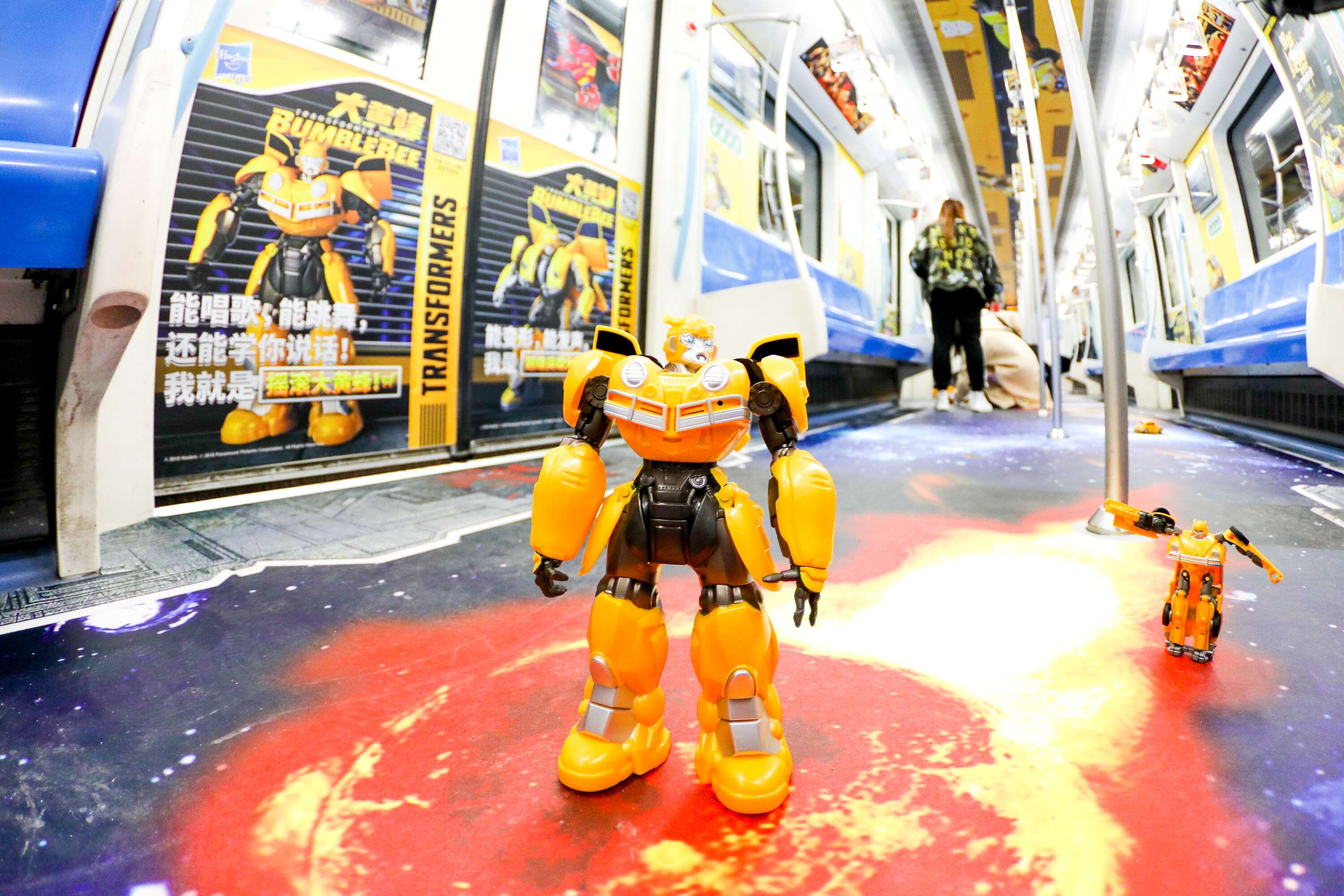 近日,一列大黃蜂主題的地鐵開(kāi)進(jìn)上海9號(hào)線。趴在頭頂憨萌可愛(ài)的大黃蜂、踩在腳下神秘莫測(cè)的塞伯坦星球、握在手里的變形金剛玩具、車(chē)壁上栩栩如生的大黃蜂售貨機(jī)……為上下班途中疲憊的通勤人員送上一個(gè)極具視覺(jué)沖擊力的超現(xiàn)實(shí)空間。