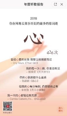 2019年1月4日,網(wǎng)易云音樂(lè)推出2018年度聽(tīng)歌報(bào)告,通過(guò)回顧過(guò)去一年聽(tīng)歌“足跡”展現(xiàn)音樂(lè)對(duì)每個(gè)人生活的陪伴,一上線(xiàn)就已經(jīng)刷屏朋友圈。