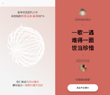值得一提的是,在聽(tīng)歌報(bào)告的結(jié)尾,網(wǎng)易云音樂(lè)還特別設(shè)置了“一歌一遇”的用戶(hù)匹配的“彩蛋”。當(dāng)瀏覽完報(bào)告后,用戶(hù)將進(jìn)入“一歌一遇”環(huán)節(jié),系統(tǒng)會(huì)自動(dòng)為你推薦一位當(dāng)前在線(xiàn)、且聽(tīng)歌口味相近的用戶(hù)。進(jìn)入聊天窗口后,將自動(dòng)播放雙方共同的紅心歌曲作為背景音樂(lè),雙方可以隨意聊天、點(diǎn)歌,也可以選擇預(yù)設(shè)的問(wèn)題考驗(yàn)?zāi)醵?。?jù)介紹,在雙方同時(shí)在線(xiàn)情況下,紅心歌單是此次用戶(hù)匹配機(jī)制的主要依據(jù),相同紅心歌曲數(shù)量越多越容易被匹配。退出對(duì)話(huà)后,還可再次匹配新的用戶(hù)。