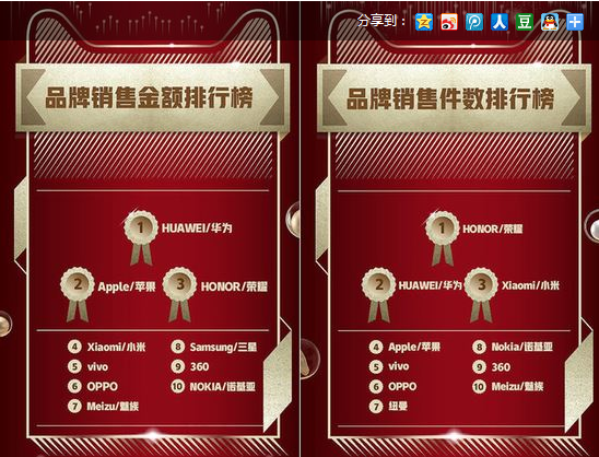 具體來說,天貓雙 12 總銷售額華為奪得冠軍,蘋果和榮耀分別排名第二、第三,小米排名第四;而總銷量方面,榮耀奪得冠軍,華為和小米分別位列第二、第三,蘋果排名第四。