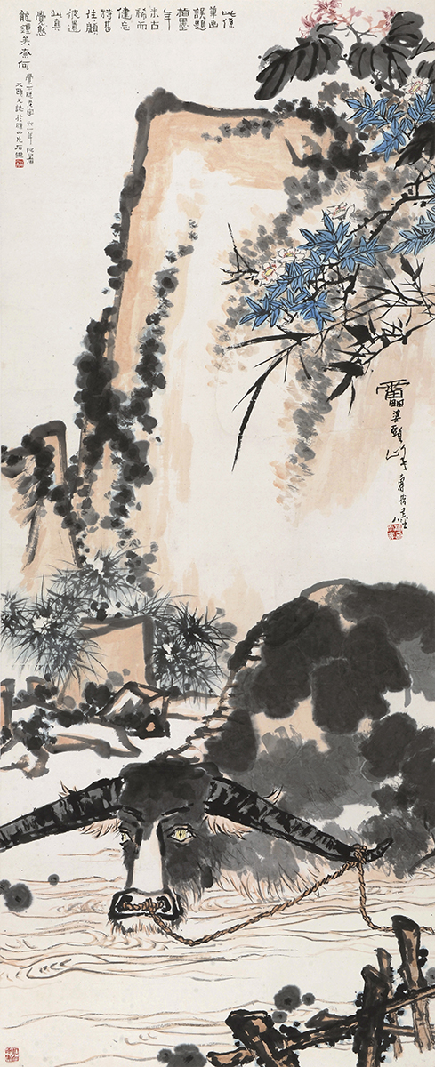 據(jù)目前所知,潘天壽存世的畫牛作品一共是四件:一件是《夏塘水牛圖》,現(xiàn)藏潘天壽紀念館;一件《耕罷》,現(xiàn)藏潘天壽老家浙江寧海市文物管理委員會;另一件同名作品《耕罷》曾于2017年春拍現(xiàn)身拍賣市場,并以一億五千多萬的高價成交;再一件就是此幅《春塘水暖圖》。四幅作品,兩幅橫構(gòu)圖,兩幅豎構(gòu)圖,都是水墨設(shè)色,其中的牛大致相同,但并不重復(fù)。橫構(gòu)圖的牛在水中裸露大半個身軀,占去了畫面的一半,畫幅橫展,水墨淋漓;而這幅《春塘水暖圖》以豎幅構(gòu)圖將牛推向近前,從而留出空間,讓巨大的“潘公石”營造背景,是獨特的潘氏構(gòu)圖。